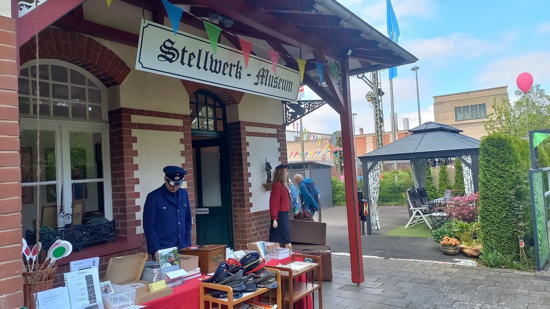 Dass das keine leeren Worte sind, konnte ich am Sonntag beobachten. Bei meiner Ankunft kam ich am Güterschuppen vorbei, der eine Außenstelle des Standesamtes Alfter ist. Eisenbahnfreundinnen und -freunde können also in der historischen Güterhalle heiraten. Am Sonntag gab es dort im Rahmen der insgesamt sehr gut besuchten Veranstaltung Kaffee und Kuchen. Neben dem Stellwerk, das seit 2011 außer Betrieb ist, hatten die Kollegen einen Stand aufgebaut, an dem man allerlei Dinge von der Eisenbahn kaufen konnte: Dienstmützen, Uniformteile, Bücher und andere Dinge wechselten dort ihren Besitzer. Die Verkäufer, die ich noch von der Uniformmodenschau in unserem Museum kannte, waren selbstverständlich stilecht uniformiert. Wer wollte, konnte sich am historischen Fahrkartenschalter über die früheren Abläufe beim Fahrkartenverkauf informieren und eine Erinnerungskarte bekommen…. oder stilgerecht ein 1. Klasse-Abteil eines Triebwagens Platz nehmen.