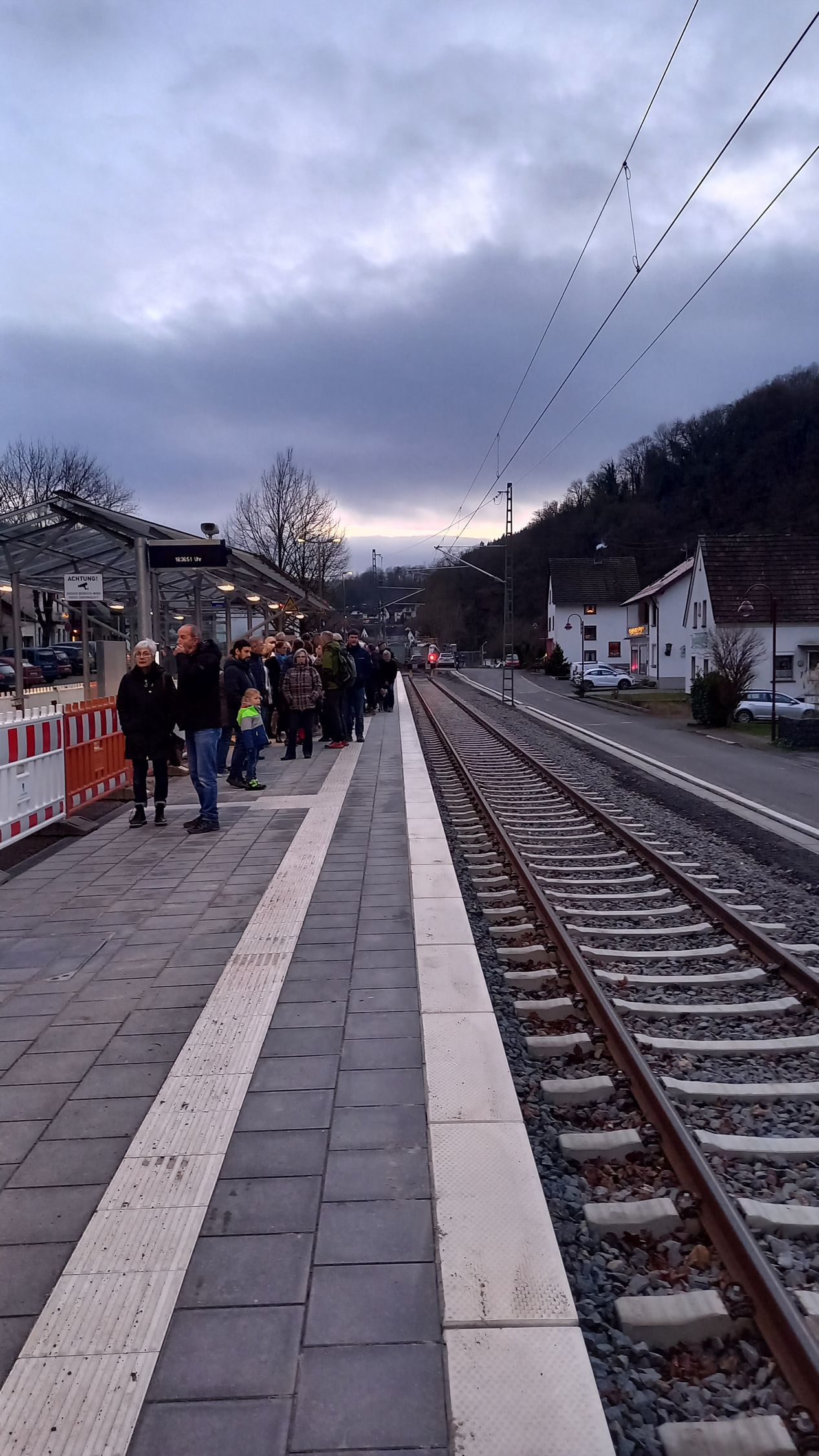 Wir hatten uns entschieden, den ersten Zug von Ahrbrück bis Dernau zu nehmen und dann nach Altenahr zurückzufahren, wo man ein Festzelt aufgebaut hatte. Gesagt, getan. Als wir mit gutem zeitlichen Vorlauf in Ahrbrück ankamen, standen bereits Menschen am Bahnsteig und warteten auf den Zug. Die planmäßige Abfahrt war um 16:51 Uhr.