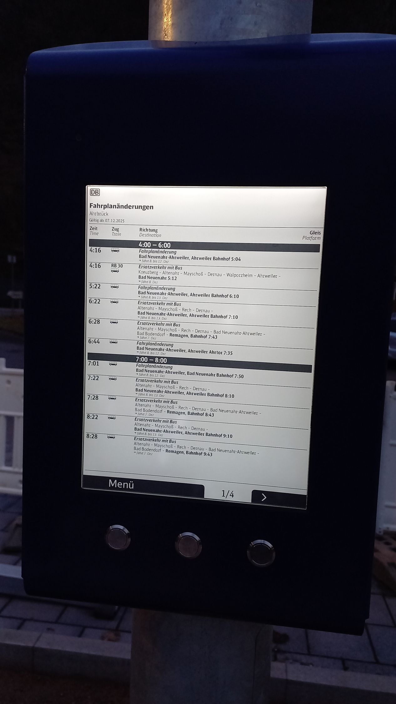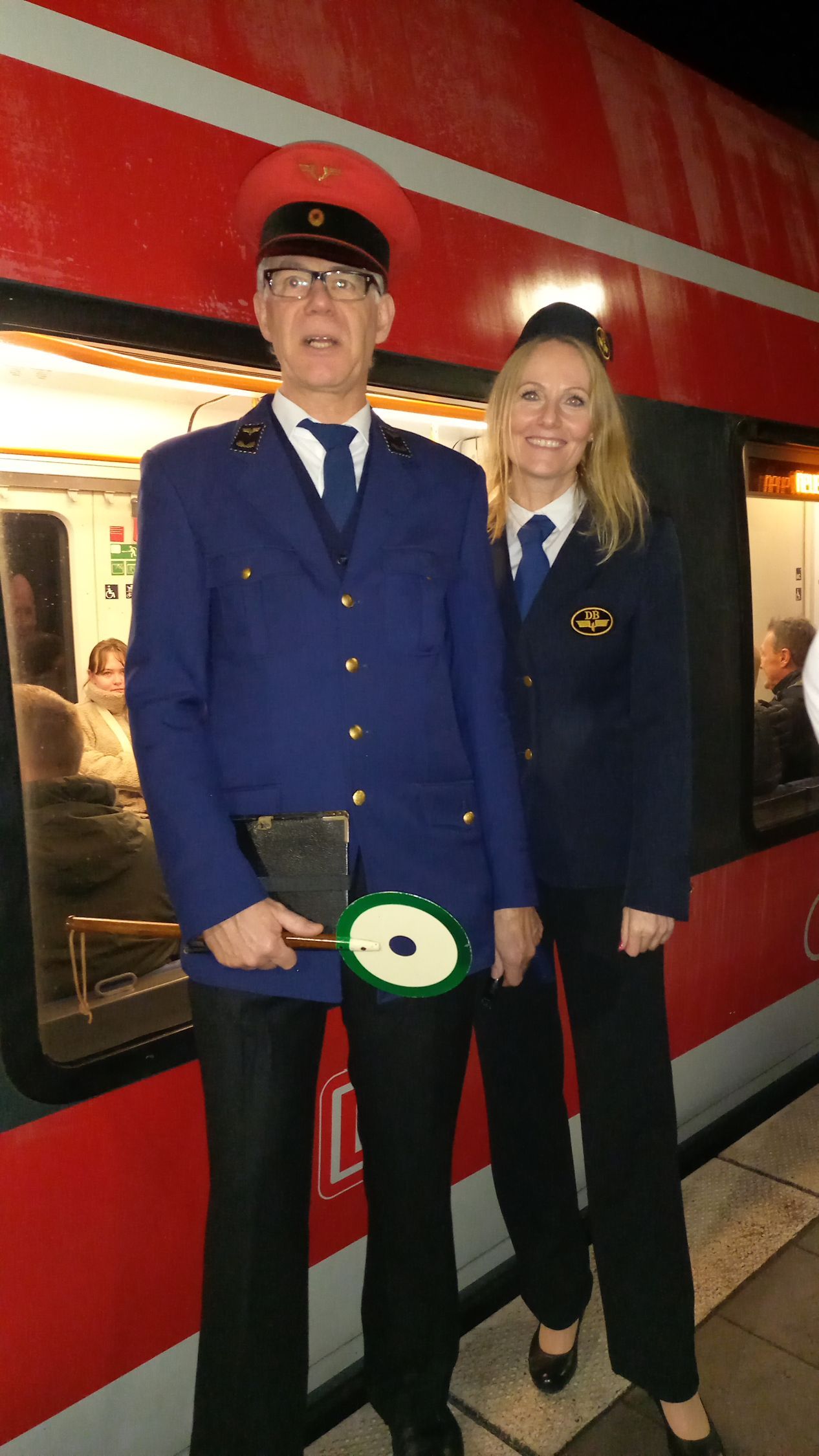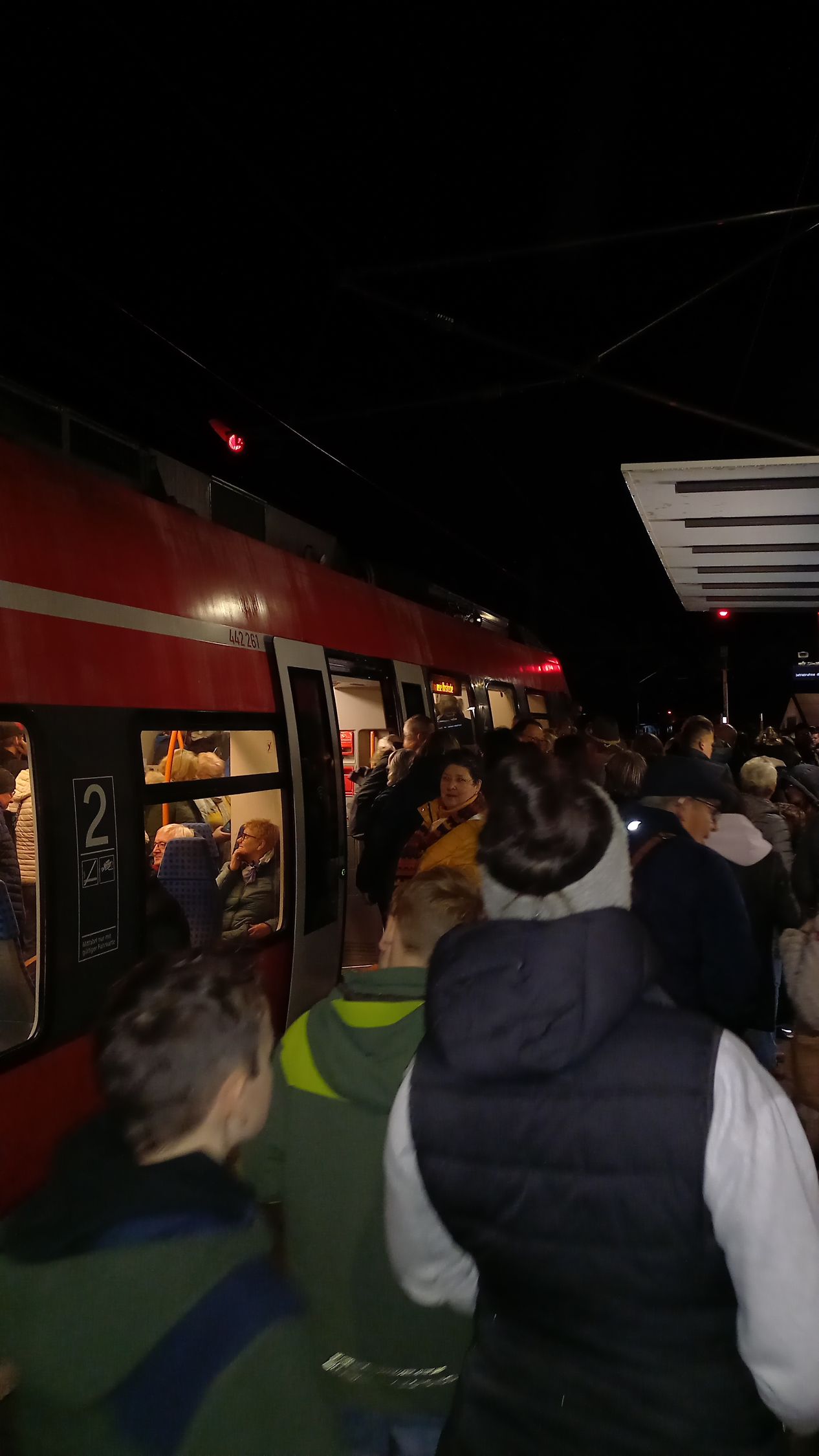 Als der Zug, ein Elektrotriebwagen der Baureihe 442, dann mit Verspätung in Ahrbrück ankam, war er ziemlich voll und nur wenige Fahrgäste wollten aussteigen. Auf der Zuglaufanzeige stand: "neue Ahrstrecke". Zum Glück hielt der Triebwagen so, dass wir eine Tür gleich vor uns hatten. Es war zwar eng, aber unser Stehplatz war erträglich und schon bald machte sich unser Triebwagen auf den Weg nach Dernau. Die Stimmung am Bahnsteig und im Zug war entspannt. Die Menschen freuten sich einfach, dass die Wiedereröffnung stattfinden konnte. Als der Zug losfuhr, war es leider schon komplett dunkel, sodass man nicht mehr so fotografieren konnte, wie es wünschenswert gewesen wäre. Aus der Ferne hatte ich einen Aufsichtsbeamten in historischer Uniform der Deutschen Bundesbahn aus den 1970er Jahren gesehen. Später stellte sich heraus, dass es sich dabei um unseren Eisenbahnfreund Stefan Ingenfeld handelte. Normalerweise sind auf der Strecke keine Aufsichtsbeamten vorgesehen, aber an diesem Tag war der Triebfahrzeugführer froh, dass es jemanden gab, der aufpasste, denn das Gedränge an den Bahnsteigen und in den Zügen war groß.